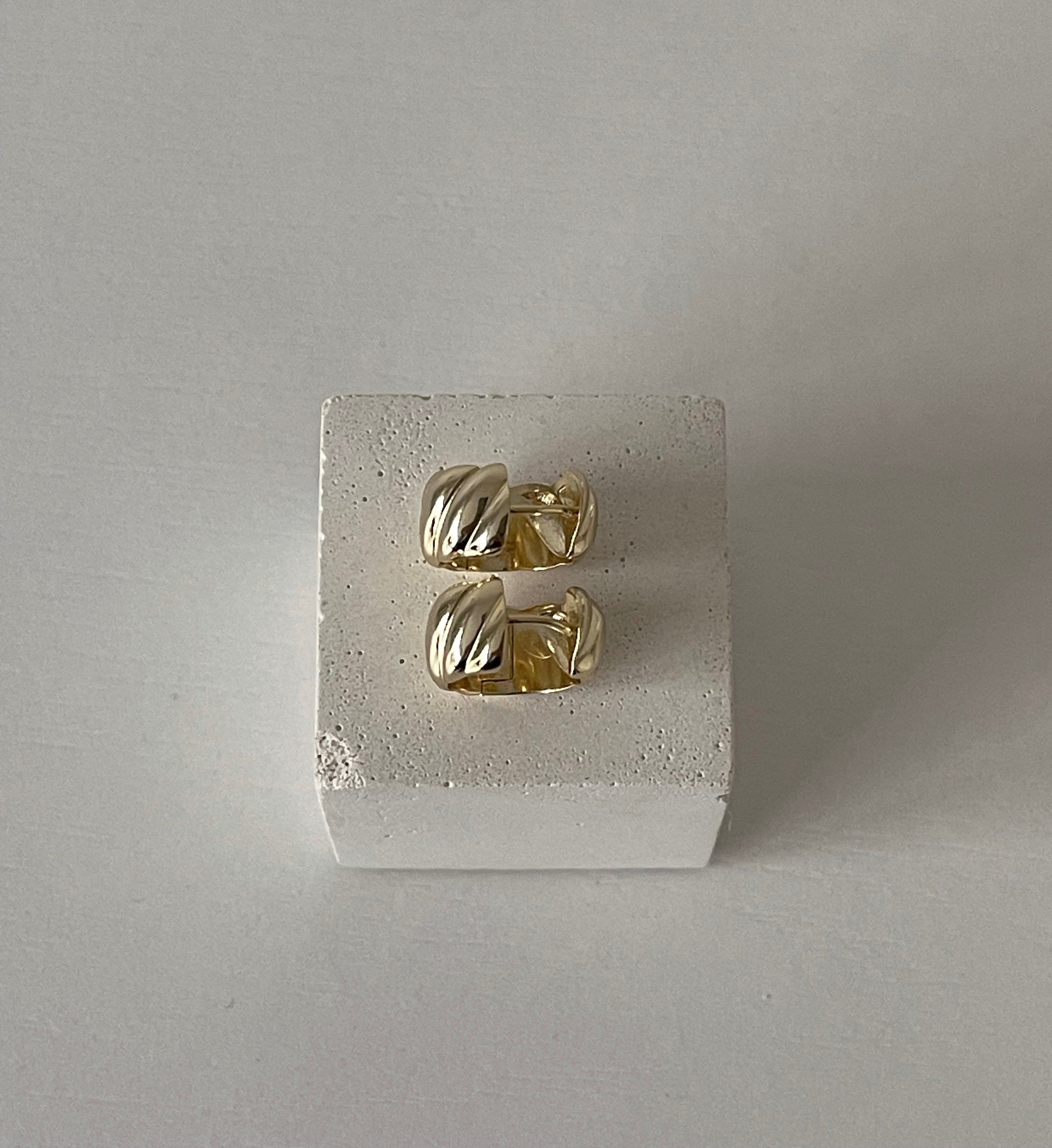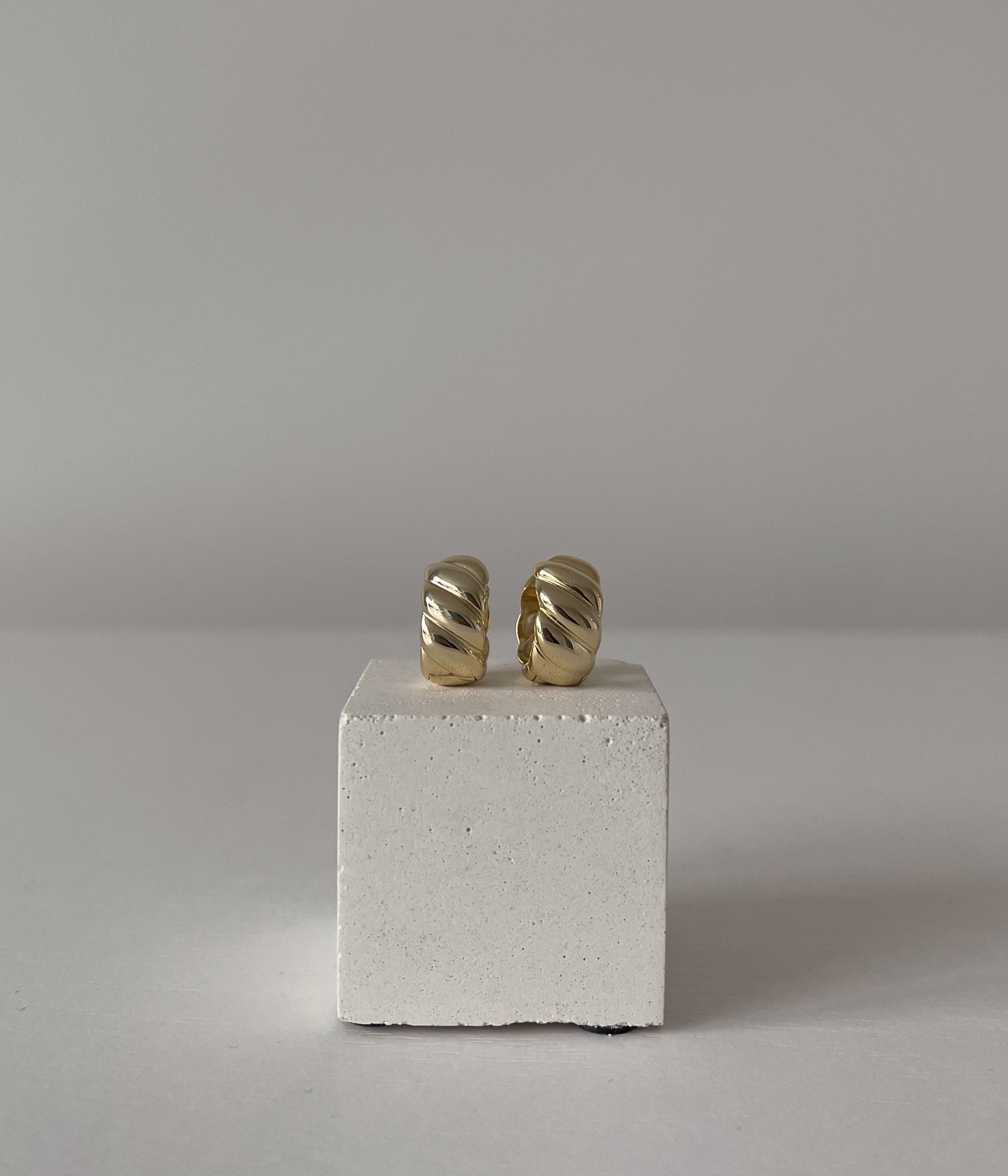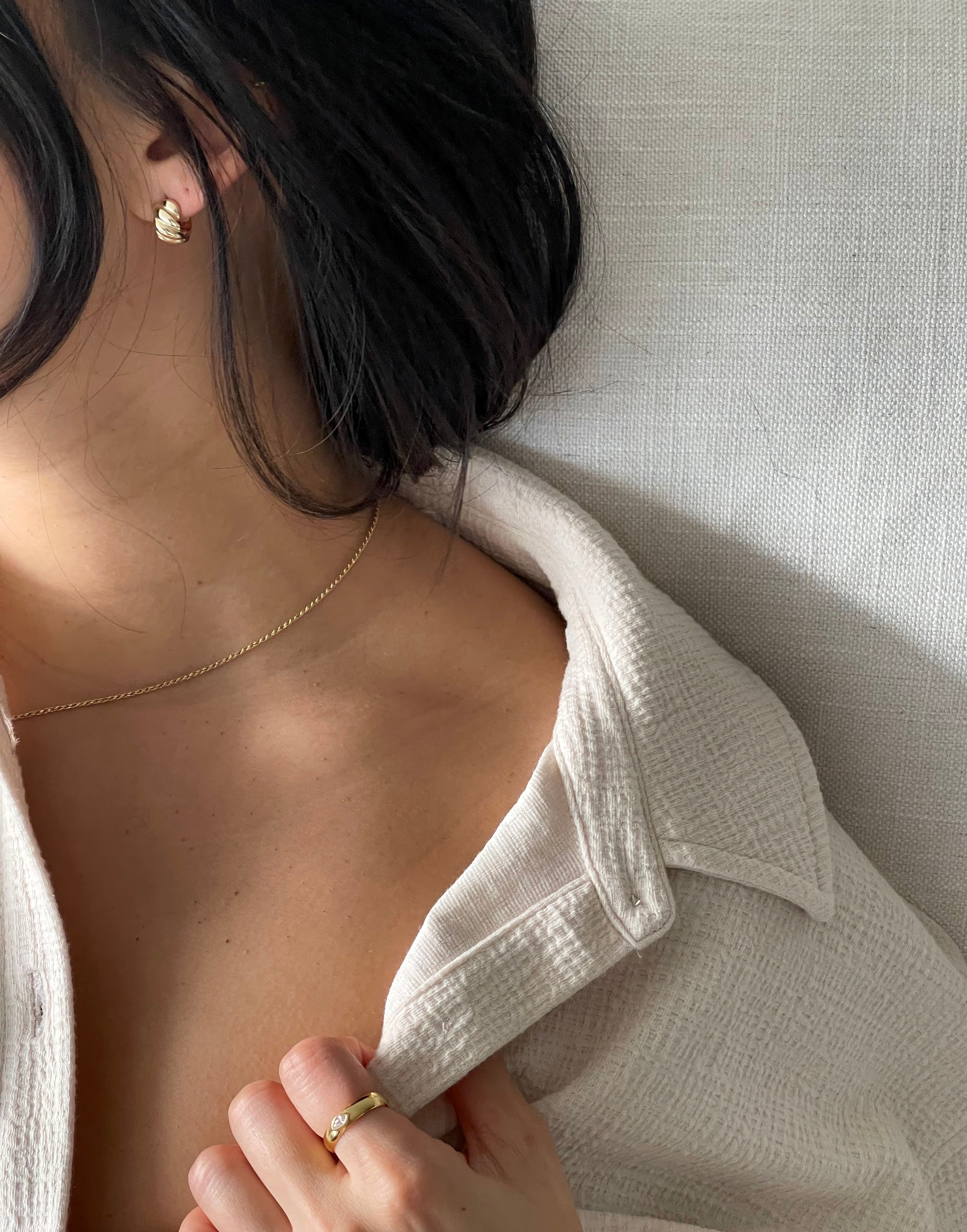 The beloved Giulia Huggies feature a croissant detail in 14K gold and are ultra-light for those with sensitive ears. These huggies are perfect for everyday outfits and for our girlies that prefer a lighter gold. Hypoallergenic and Non-tarnish.
