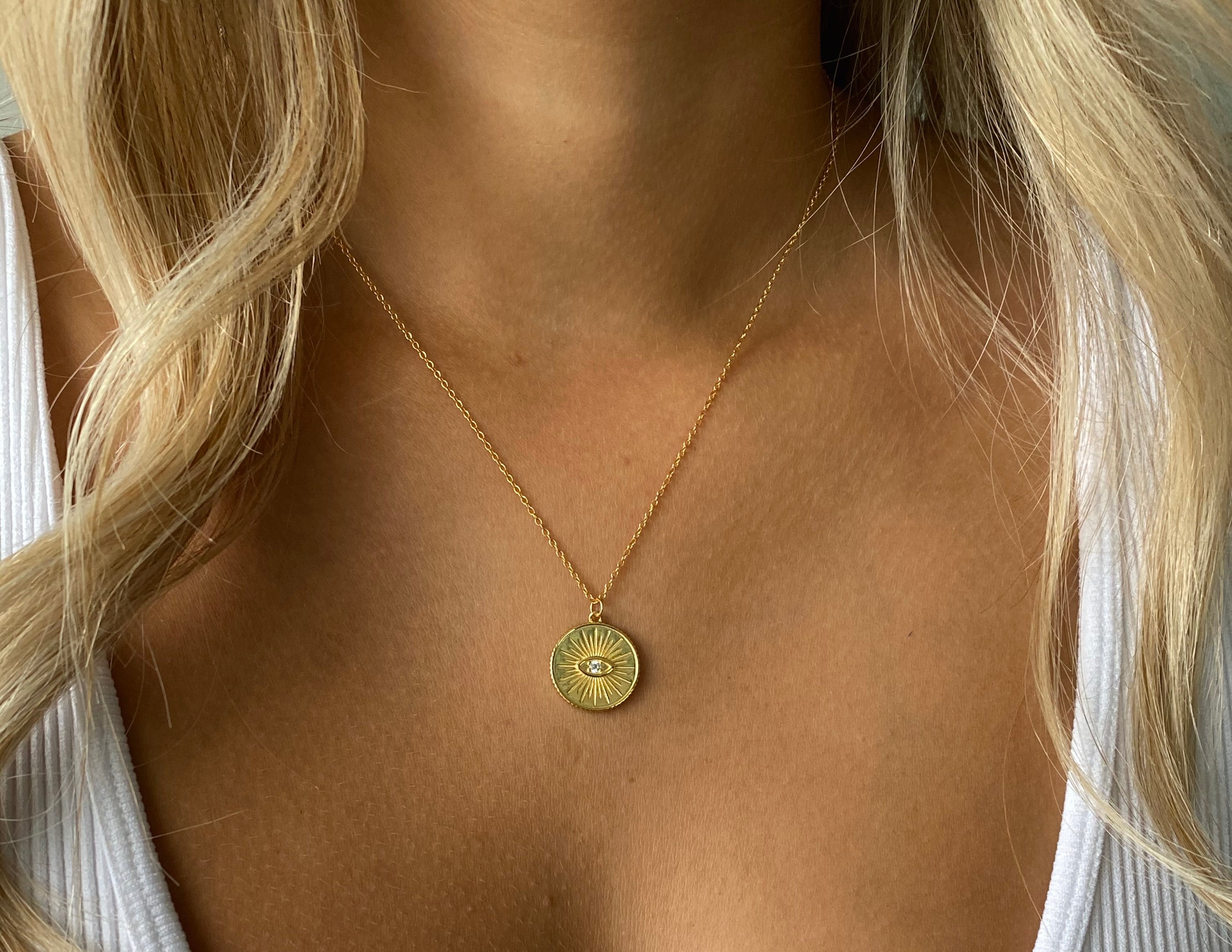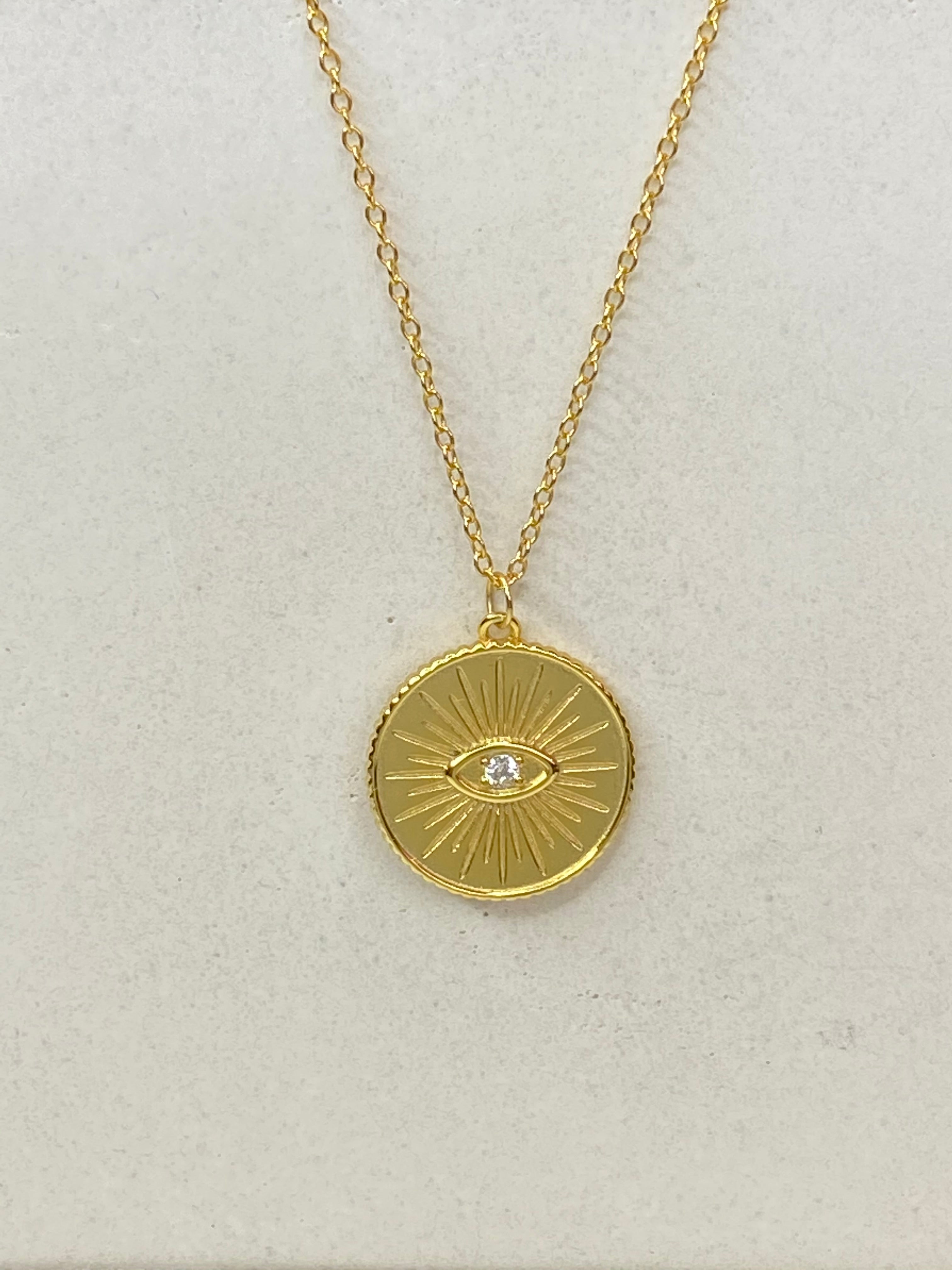 A coin pendant with the iconic evil eye and subtle vintage brushed edges.